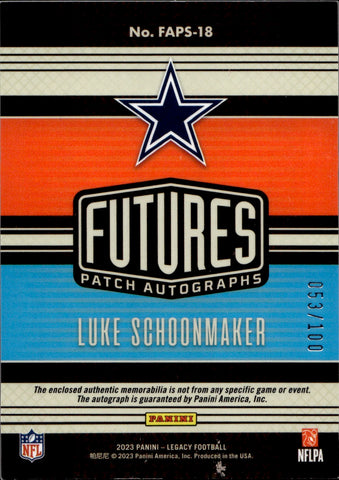 2023 Luke Schoonmaker Panini Legacy FUTURES PATCH AUTOGRAPHS RUBY ROOKIE JERSEY AUTO 53/100 Dallas Cowboys FAPS-18