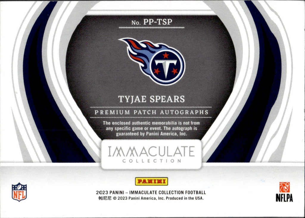 2023 Tyjae Spears Panini Immaculate Collection ROOKIE EMERALD GREEN JUMBO PATCH AUTO 13/18 AUTOGRAPH RELIC RC #PP-TSP Tennessee Titans