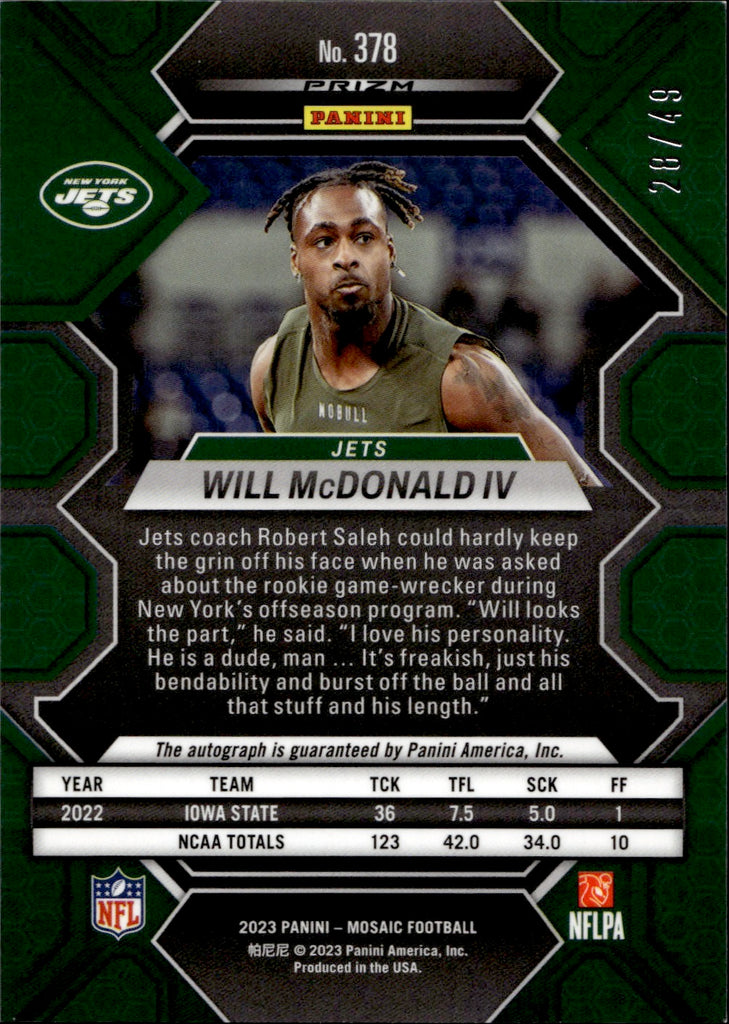 2023 Will McDonald IV Panini Mosaic PURPLE ROOKIE AUTO 28/99 AUTOGRAPH RC #378 New York Jets