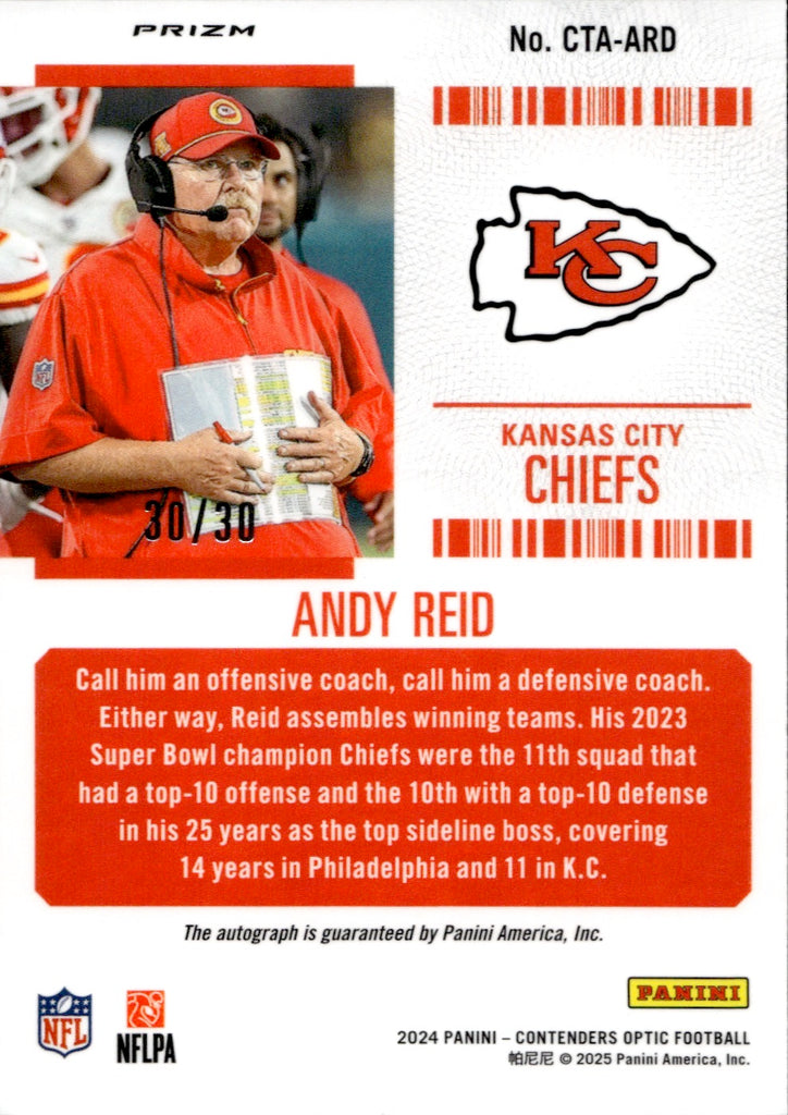 2024 Andy Reid Contenders Optic GREEN PULSAR COACHES TICKET AUTO 30/30 AUTOGRAPH #CTA-ARD Kansas City Chiefs