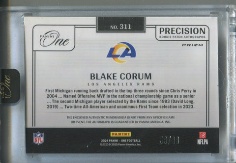 2024 Blake Corum Panini One PRECISION ROOKIE PATCH AUTO 59/99 AUTOGRAPH RELIC #311 Los Angeles Rams