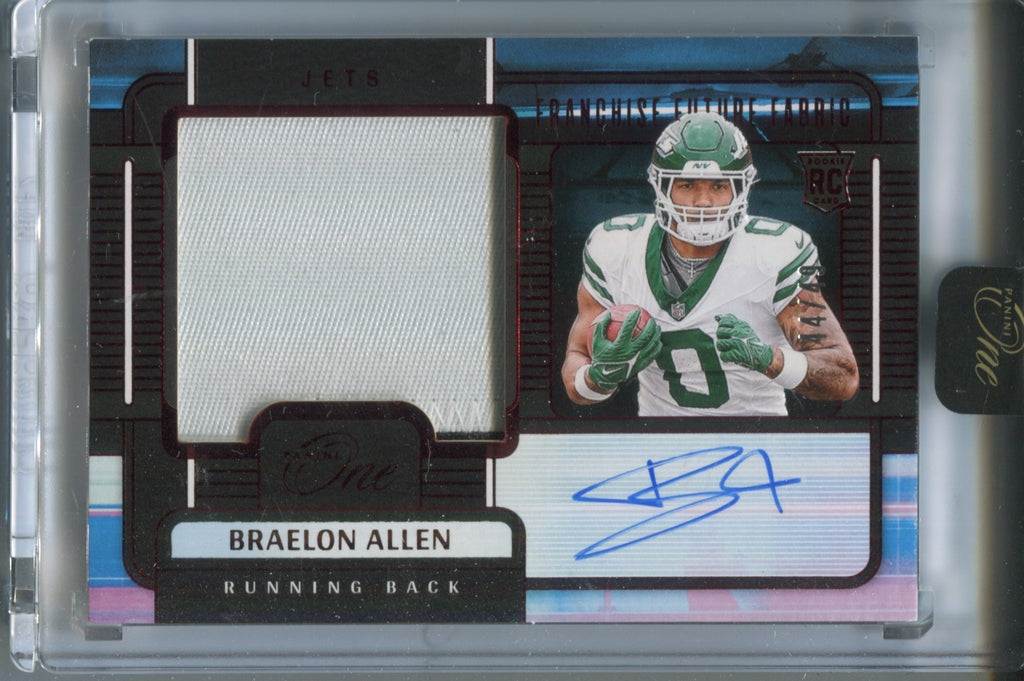 2024 Braelon Allen Panini One RED ROOKIE FRANCHISE FUTURE FABRICS JUMBO PATCH AUTO 44/49 AUTOGRAPH RELIC RC #85 New York Jets