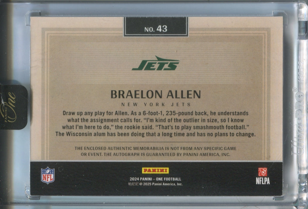 2024 Braelon Allen Panini One ROOKIE DUAL PATCH AUTO 048/199 AUTOGRAPH RELIC #43 New York Jets
