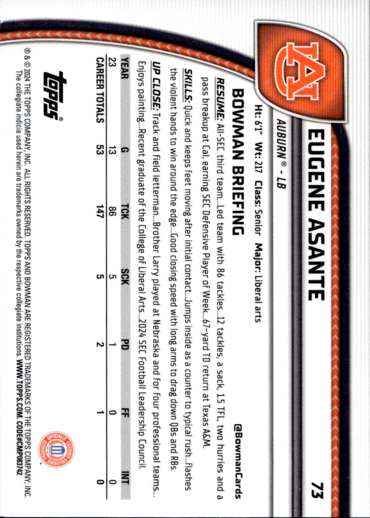 2024 Eugene Asante Topps Bowman Chrome University ORANGE SHIMMER REFRACTOR 1ST BOWMAN 3/25 Auburn Tigers #73