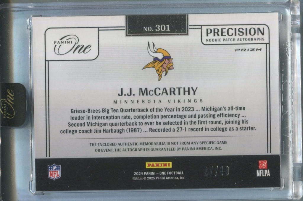2024 J.J. McCarthy Panini One PRECISION GREEN ROOKIE PATCH AUTO 27/40 AUTOGRAPH RELIC #301 Minnesota Vikings
