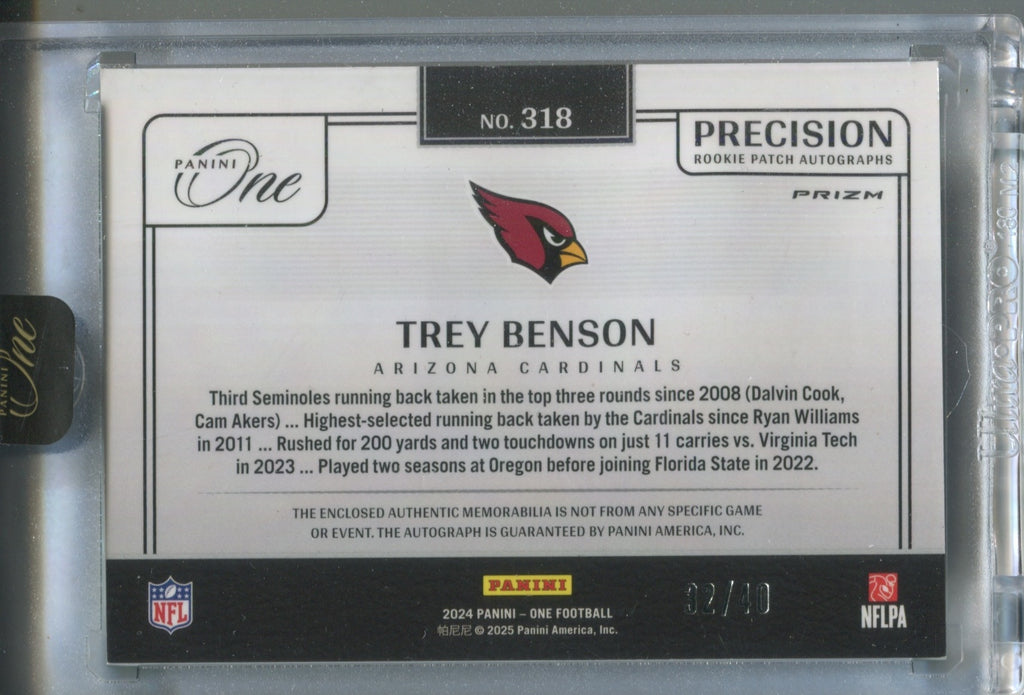 2024 Trey Benson Panini One GREEN PRECISION ROOKIE JUMBO PATCH AUTO 32/40 AUTOGRAPH RELIC #318 Arizona Cardinals