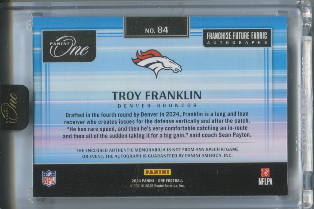 2024 Troy Franklin Panini One ROOKIE FRANCHISE FUTURE FABRICS JUMBO PATCH AUTO 26/49 AUTOGRAPH RELIC RC #84 Denver Broncos