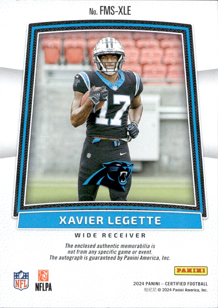 2024 Xavier Legette Panini Certified FRESHMAN FABRIC ROOKIE AUTOGRAPH JERSEY PATCH 102/299 AUTO RC #FMS-XLE Carolina Panthers