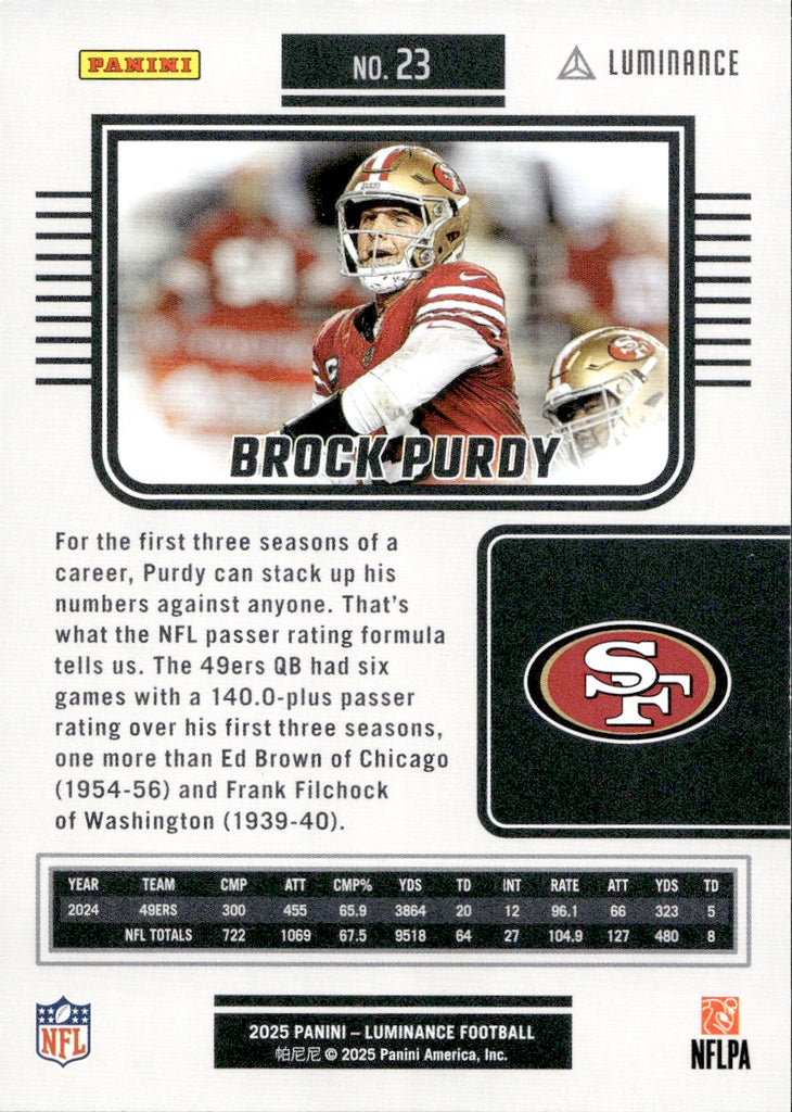 2025 Brock Purdy Panini Luminance BLUE 19/199 #23 San Francisco 49ers
