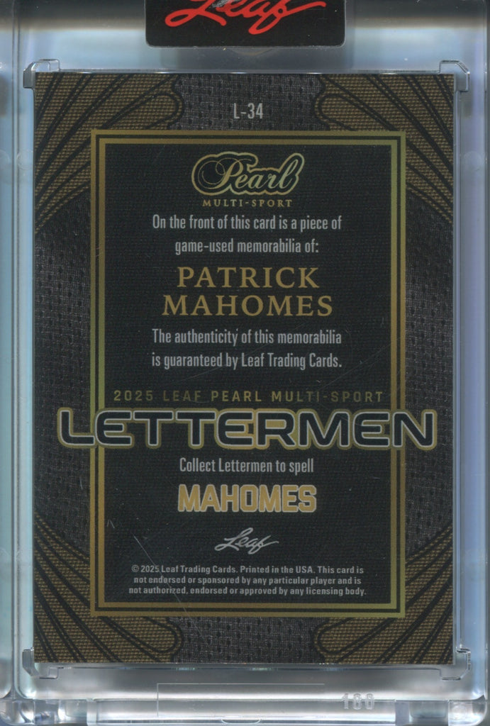 2025 Patrick Mahomes Leaf Pearl Multi-Sport GAME USED LETTERMAN 7/8 RELIC #L-34 Texas Tech Red Raiders