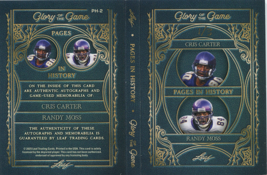 2025 Randy Moss Cris Carter Leaf Glory of the Game PAGES IN HISTORY 8 PIECE AUTO DUAL AUTO 1/3 AUTOGRAPH RELIC BOOKLET #PH-2 Minnesota Vikings HOF