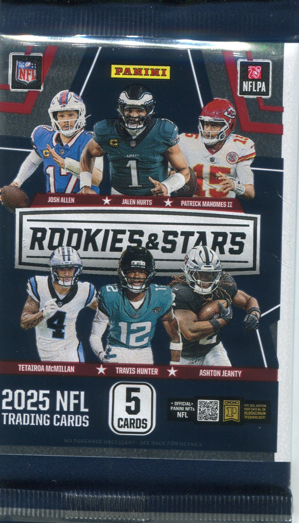• Rookies & Stars Football returns for the 2025 season, packing calling-card inserts, such as Touchdown Club, Artistry in Motion, Draft Class, Rookie Signature Red parallels and more!