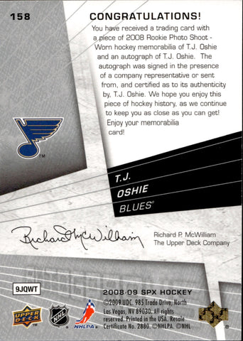 2008-09 T.J. Oshie Upper Deck SPx ROOKIE DUAL JERSEY AUTO 850/999 AUTOGRAPH RELIC RC #158 St. Louis Blues