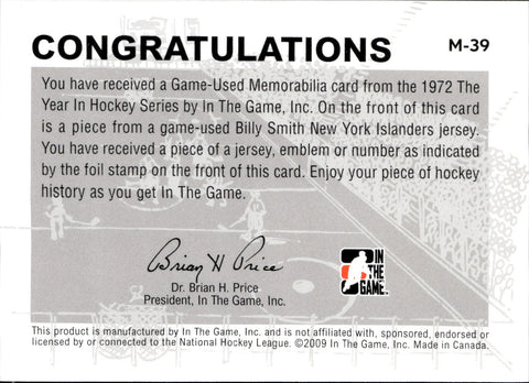 2009 Billy Smith In The Game 1972 THE YEAR JERSEY SILVER #M-39 New York Islanders