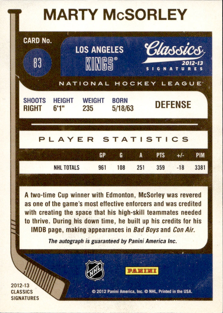 2012-13 Marty McSorley Panini Classics Signatures AUTOGRAPH AUTO #83 Los Angeles Kings 1