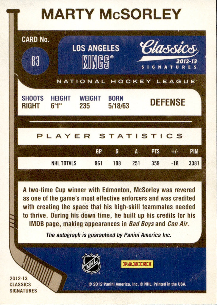 2012-13 Marty McSorley Panini Classics Signatures AUTOGRAPH AUTO #83 Los Angeles Kings 2