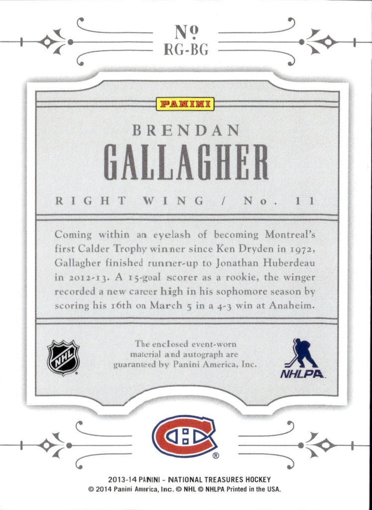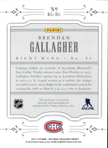 2013-14 Brendan Gallagher Panini National Treasures ROOKIE NHL GEAR AUTOGRAPH JERSEY AUTO RC 67/75 #RG-BG Montreal Canadiens