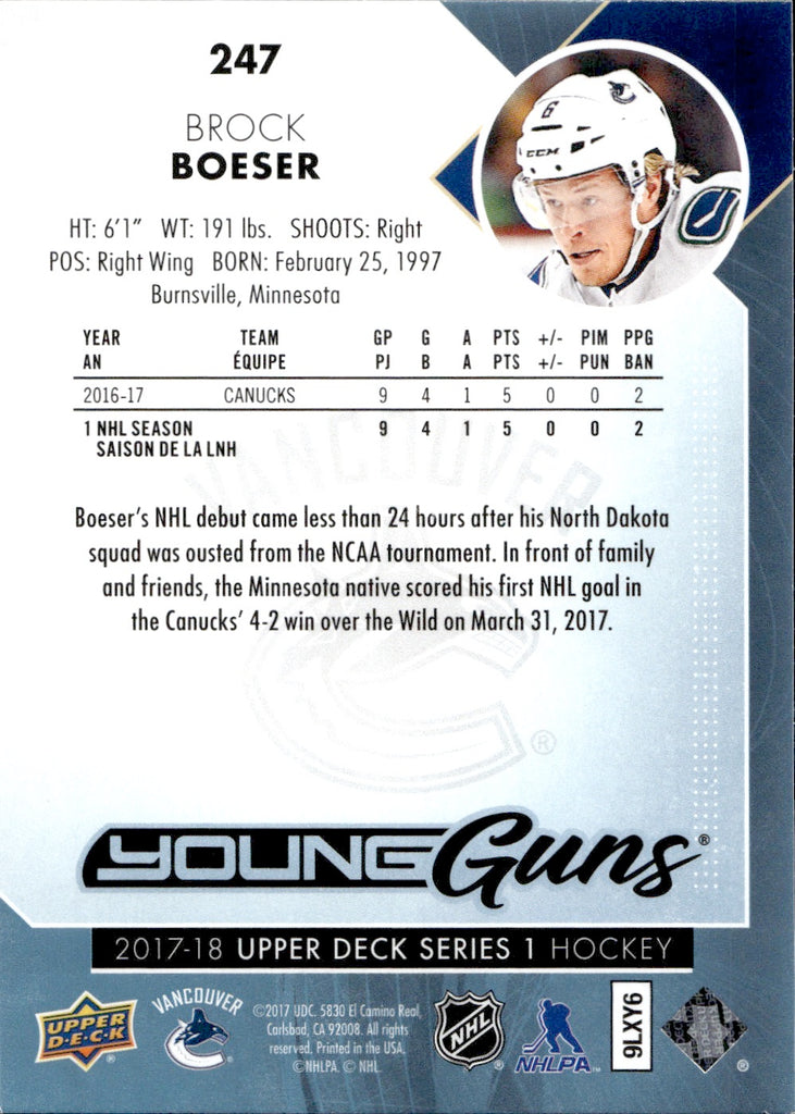 2017-18 Brock Boeser Upper Deck Series 1 YOUNG GUNS ROOKIE RC #247 Vancouver Canucks