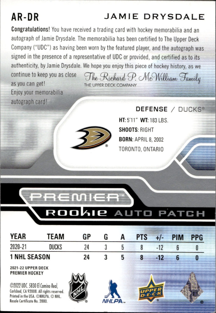 2021-22 Jamie Drysdale Upper Deck Premier ROOKIE PATCH AUTO 59/99 AUTOGRAPH RELIC AR-DR Anaheim Ducks
