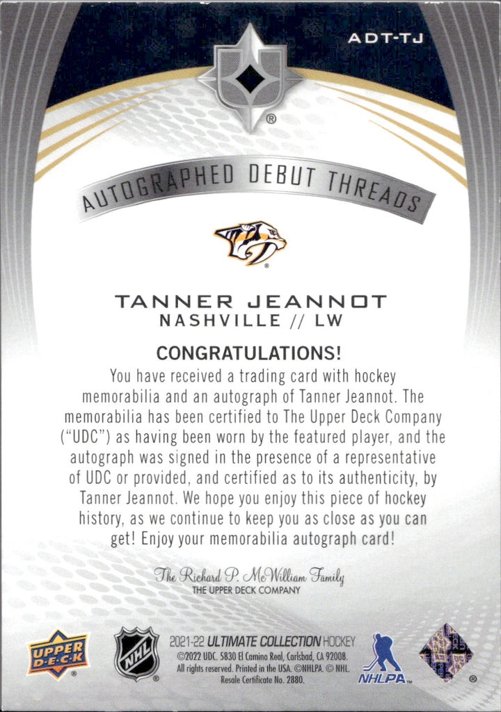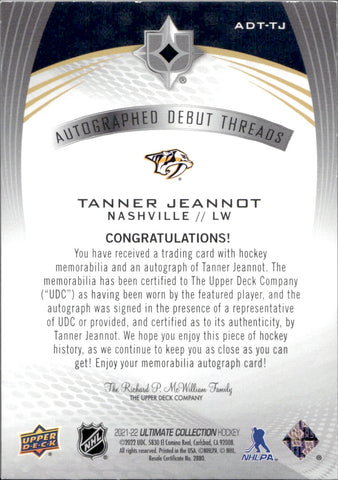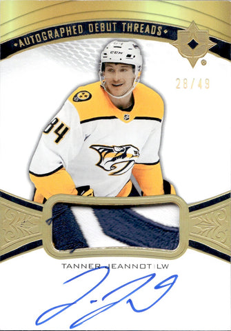2021-22 Tanner Jeannot Upper Deck Ultimate AUTOGRAPHED DEBUT THREADS ROOKIE 28/49 AUTO RC PATCH #ADT-TJ Nashville Predators