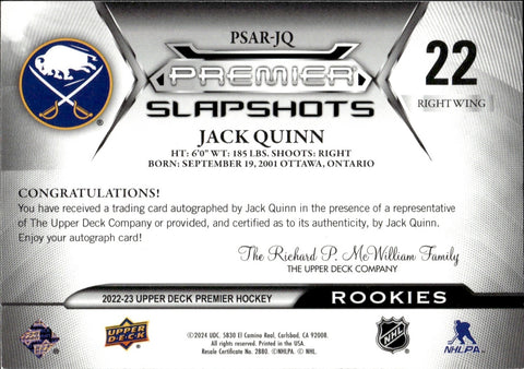 2022-23 Jack Quinn Upper Deck Premier ROOKIE SLAPSHOTS AUTO AUTOGRAPH RC #PSAR-JQ Buffalo Sabres