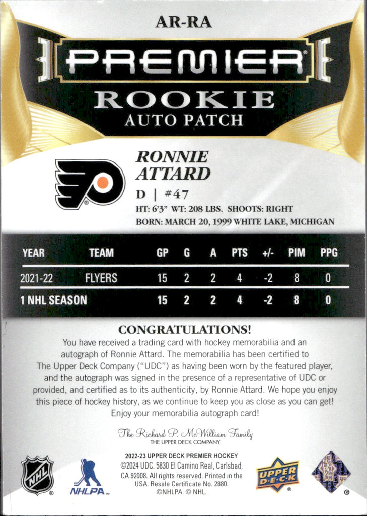 2022-23 Ronnie Attard Upper Deck Premier ROOKIE AUTO PATCH 57/65 AUTO RC #AR-RA Philadelphia Flyers
