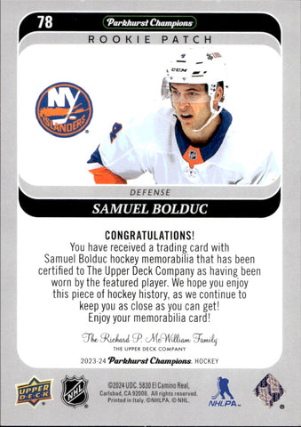 2023-24 Samuel Bolduc Upper Deck Parkhurst Champions ROOKIE PATCH 7/25 RC #78 New York Islanders