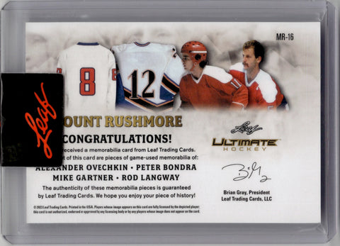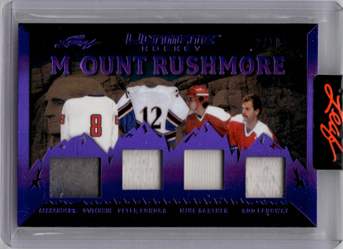 2023 Alexander Ovechkin Peter Bondra Mike Gartner Rob Langway Leaf Ultimate Hockey PURPLE FOIL MOUNT RUSHMORE QUAD JERSEY 03/10 RELIC #MR-16 Washington Capitals