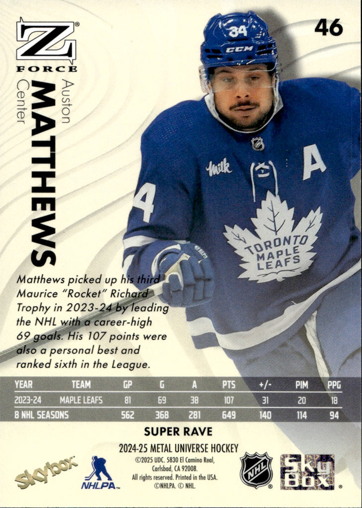 2024-25 Auston Matthews Upper Deck Skybox Metal Universe Z-FORCE SUPER RAVE 34/50 JERSEY NUMBER #46 Toronto Maple Leafs