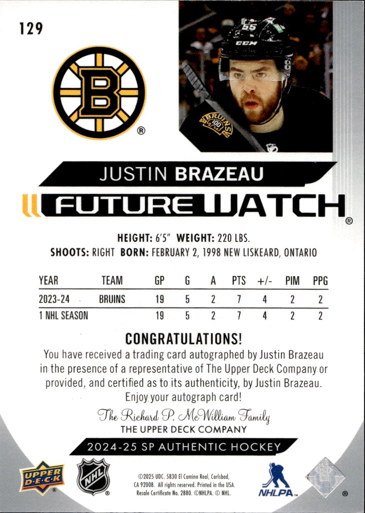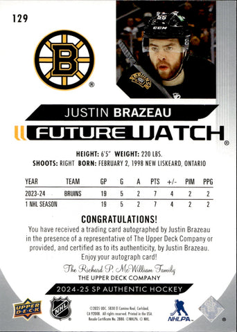 2024-25 Justin Brazeau Upper Deck Sp Authentic FUTURE WATCH AUTO 539/599 Boston Bruins #129