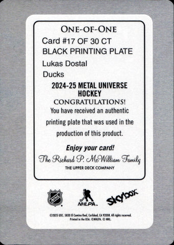 2024-25 Lukas Bostal Upper Deck Skybox Metal Universe COUNTERPOISE BLACK PRINTING PLATE 1/1 ONE OF ONE #17 Anaheim Ducks