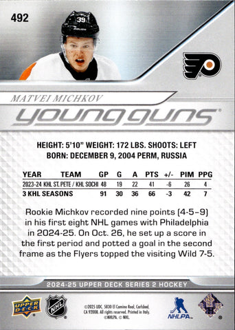 2024-25 Matvei Michkov Upper Deck Series 2 ROOKIE YOUNG GUNS RC #492 Philadelphia Flyers