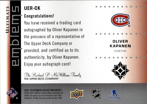 2024-25 Oliver Kapanen Upper Deck Ultimate EMBLEMS ROOKIE AUTO AUTOGRAPH RC #UER-OK Montreal Canadiens