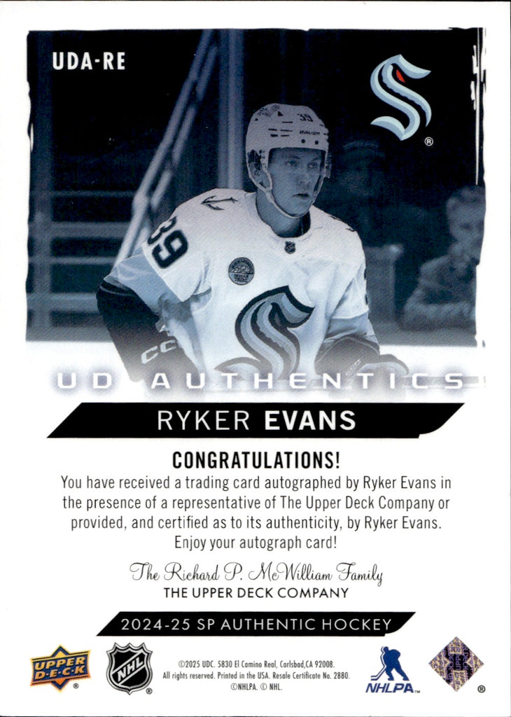 2024-25 Ryker Evans Upper Deck Sp Authentic UD AUTHENTICS AUTO Seattle Kraken #UDA-RE