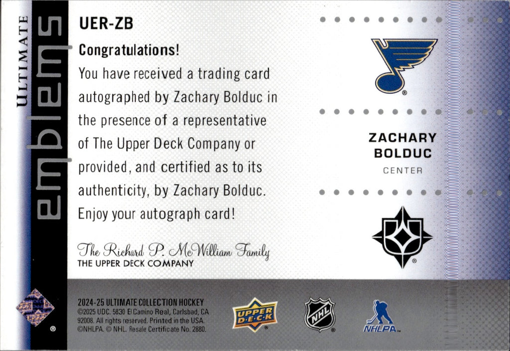 2024-25 Zachary Bolduc Upper Deck Ultimate Collection ULTIMATE EMBLEMS ROOKIE AUTO AUTOGRAPH RC #UER-ZB St. Louis Blues