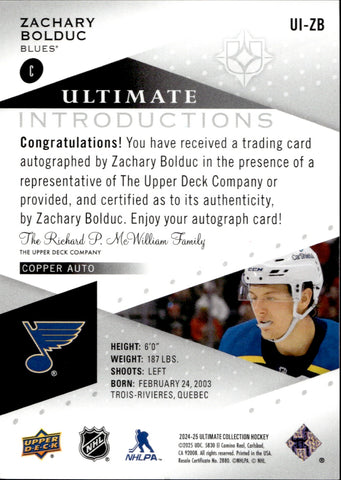 2024-25 Zachary Bolduc Upper Deck Ultimate INTRODUCTIONS ROOKIE AUTO AUTOGRAPH #UI-ZB St. Louis Blues
