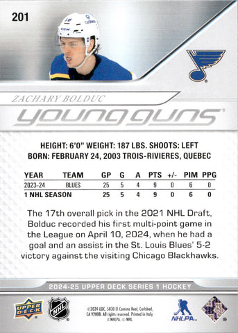 2024-25 Zachary Bolduc Upper Deck YOUNG GUNS ROOKIE RC #201 St. Louis Blues