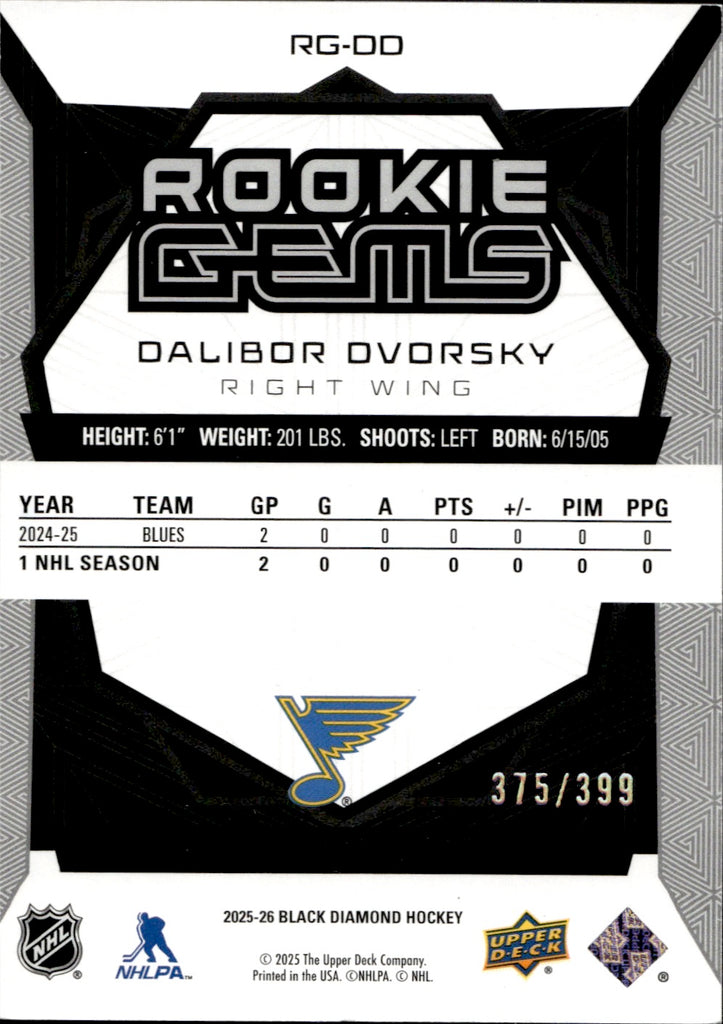 2025-26 Dalibor Dvorsky Upper Deck Black Diamond ROOKIE GEMS 375/399 RC #RG-DD St. Louis Blues