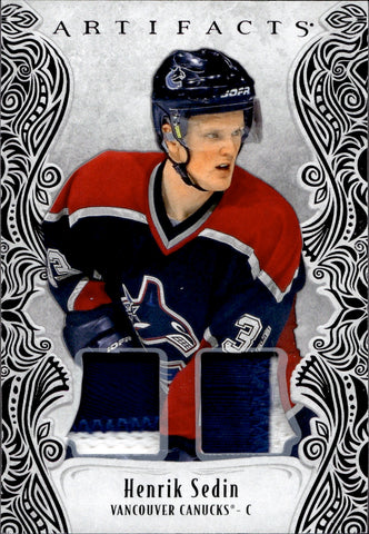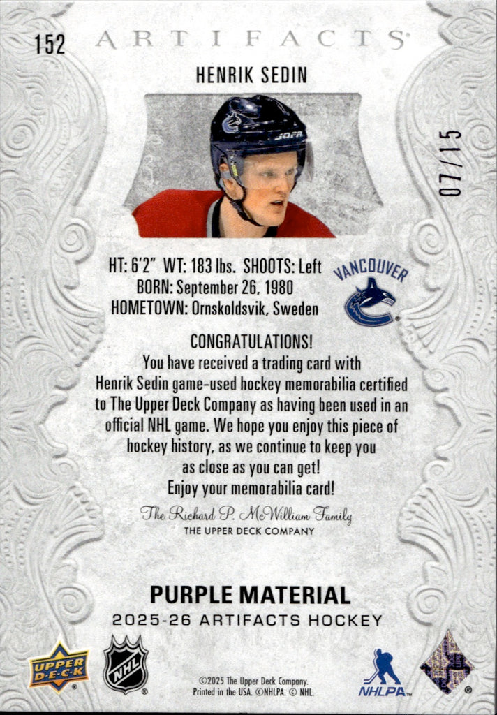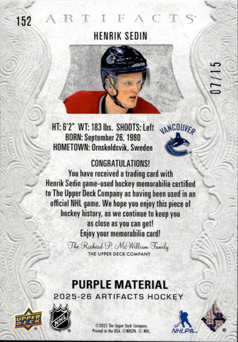 2025-26 Henrik Sedin Upper Deck Artifacts PURPLE DUAL PATCH 07/15 RELIC #152 Vancouver Canucks