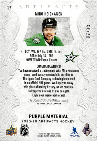 2025-26 Miro Heiskanen Upper Deck Artifacts PURPLE DUAL PATCH 02/25 RELIC #17 Dallas Stars