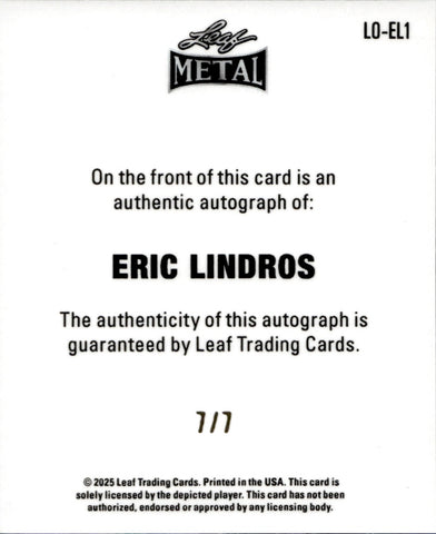 2025 Eric Lindros Leaf Metal Legends LEAF ORIGINALS 1948 PURPLE SHIMMER INSCRIPTION AUTO 7/7 AUTOGRAPH #LO-EL1 Philadelphia Flyers HOF