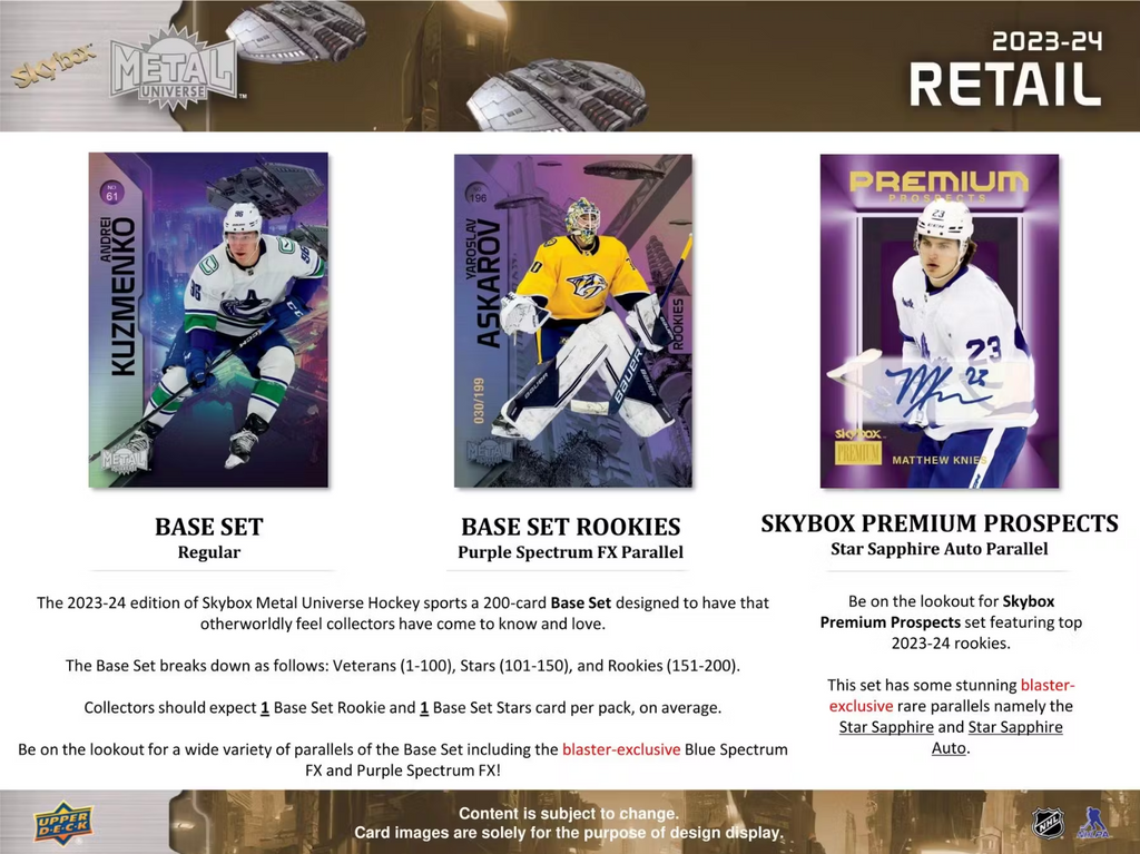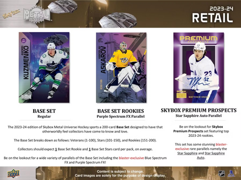 - The 2023-24 edition of Skybox Metal Universe Hockey sports a 200-card Base Set designed to have that otherworldly feel collectors have come to know and love.