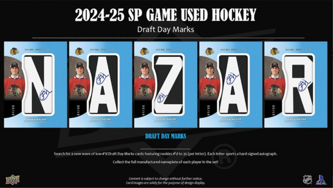 - Search for a new wave of Draft Day Marks cards featuring rookies #’d to 35 (per letter). Each letter sports a hard-signed autograph. Collect the full manufactured nameplate of each player in the set!