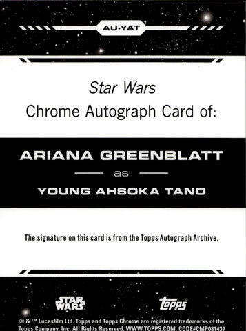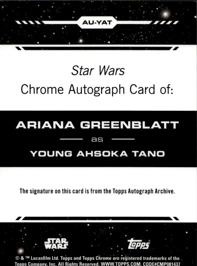 2024 Ariana Greenblatt as Young Ahsoka Tano Topps Chrome Star Wars PURPLE REFRACTOR ROOKIE DEBUT AUTO 015/199 AUTOGRAPH #AU-YAT Ahsoka