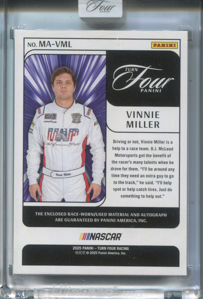 2025 Vinnie Miller Panini Turn Four RED FOIL FIRE SUIT AUTO 09/15 AUTOGRAPH RELIC #MA-VML B. J. McLeod Motorsports