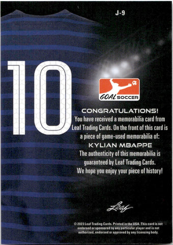 2023 Kylian Mbappe Leaf Goal Soccer GAME-USED MEMORABILIA JERSEY #J-9 France