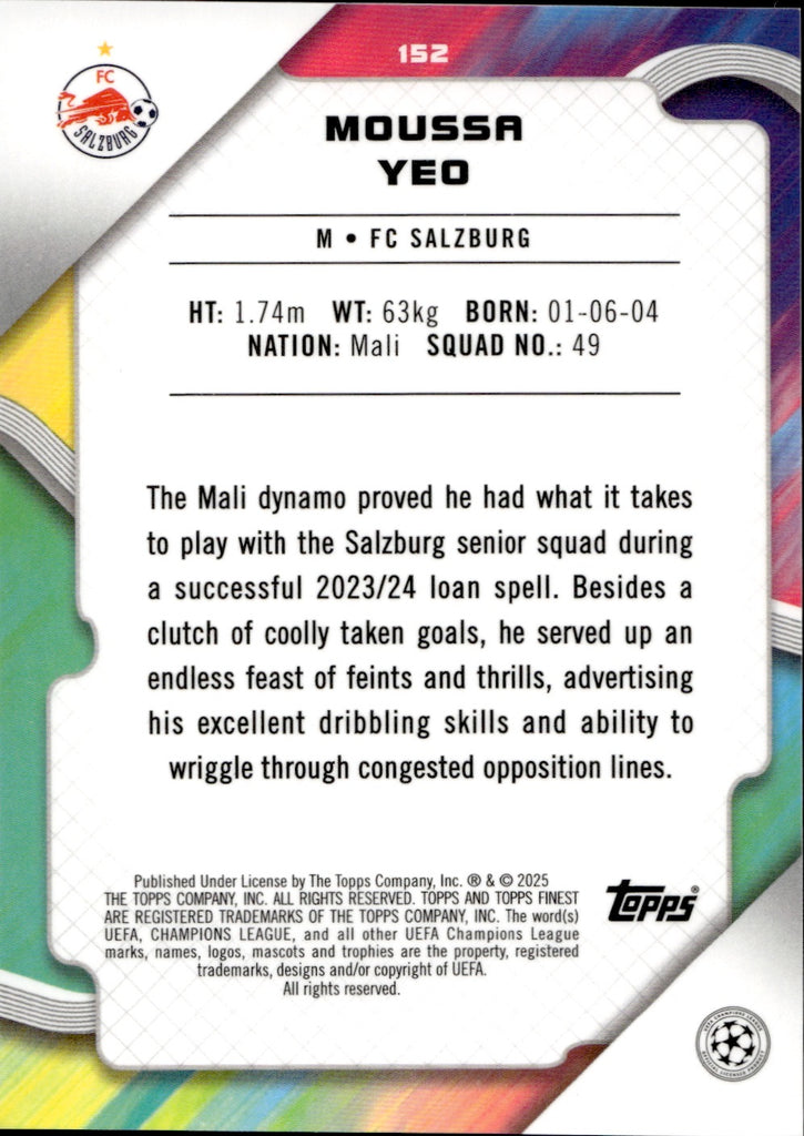 2024-25 Moussa Yeo Topps Finest UEFA Club Competitions ROOKIE GOLD REFRACTOR 07/50 RC #152 FC Salzburg