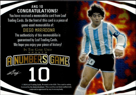 2024 Diego Maradona Leaf In the Game Used PURPLE FOIL A NUMBERS GAME JERSEY 4/9 RELIC #ANF-10 Argentina