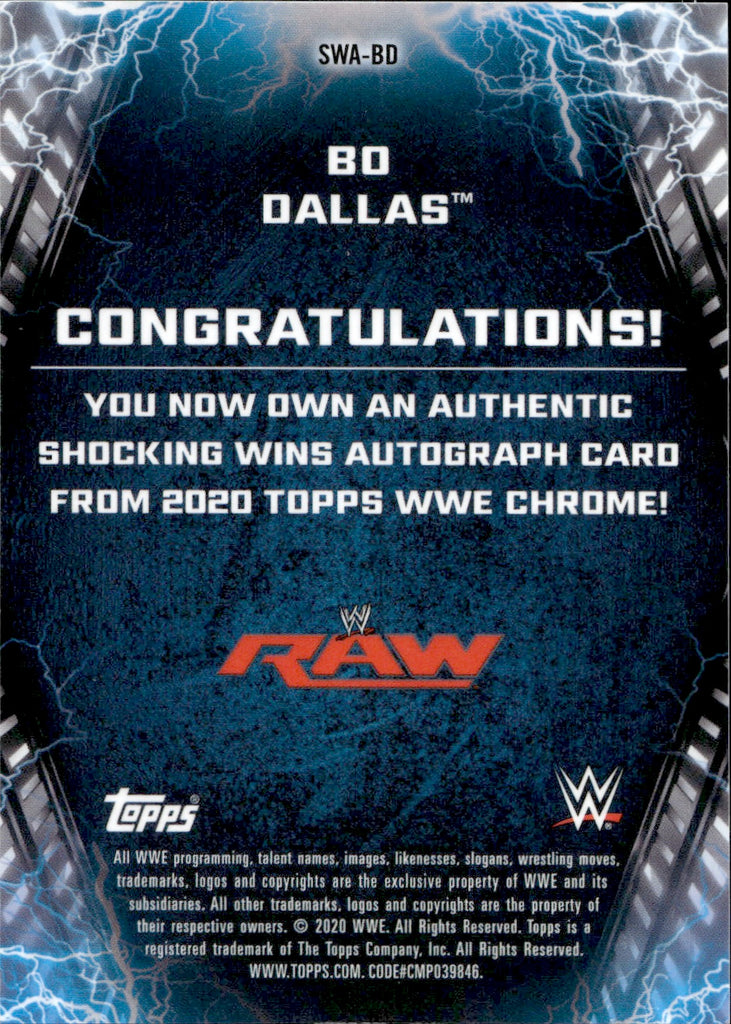 2020 Bo Dallas Topps Chrome WWE SHOCKING WINS REFRACTOR AUTO 037/199 AUTOGRAPH #SWA-BD Monday Night Raw