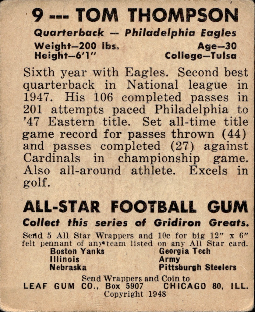 1948 Tommy Thompson Leaf Philadelphia Eagles #9 BV$40